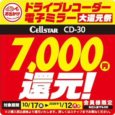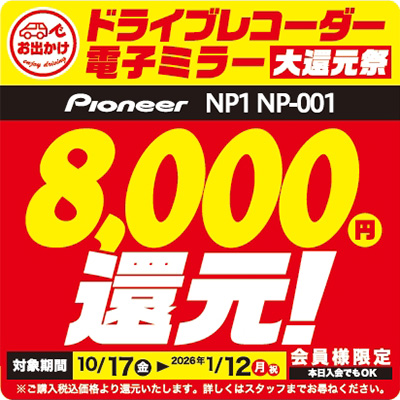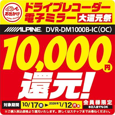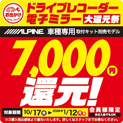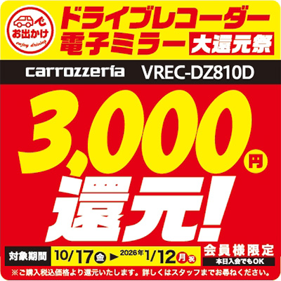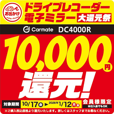 ドライブレコーダー・電子ミラー大還元祭の対象商品の一例です。全方位複数カメラタイプ・前後2カメラタイプ・電子ミラー[デジタルミラー]タイプなどを還元対象としてご用意しています、是非店舗でお確かめください。
