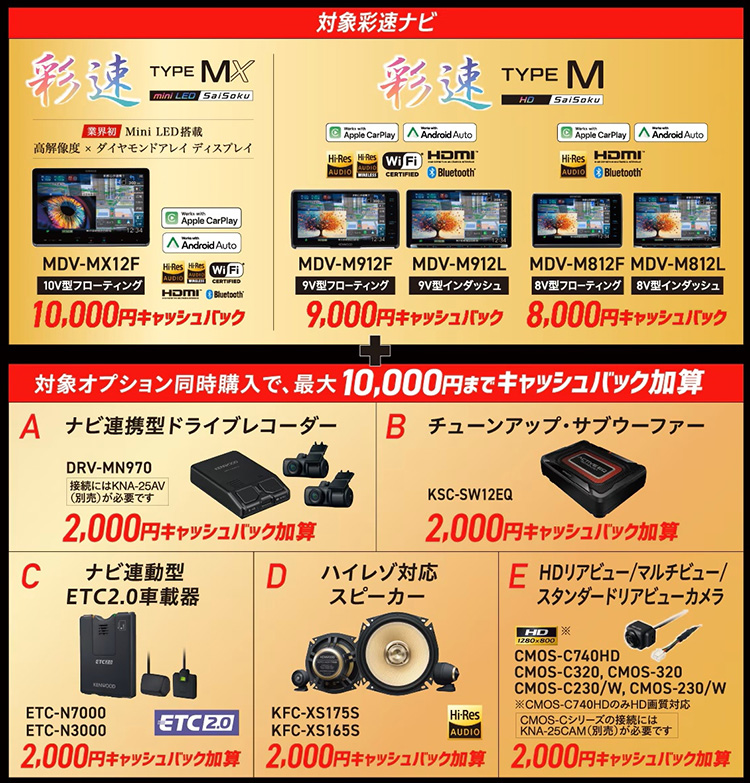 - MDV-MX12F+DRV-MN970+KSC-SW12EQ+ETC-N7000+KFC-XS175S+CMOS-C740HD購入で20,000円キャッシュバック